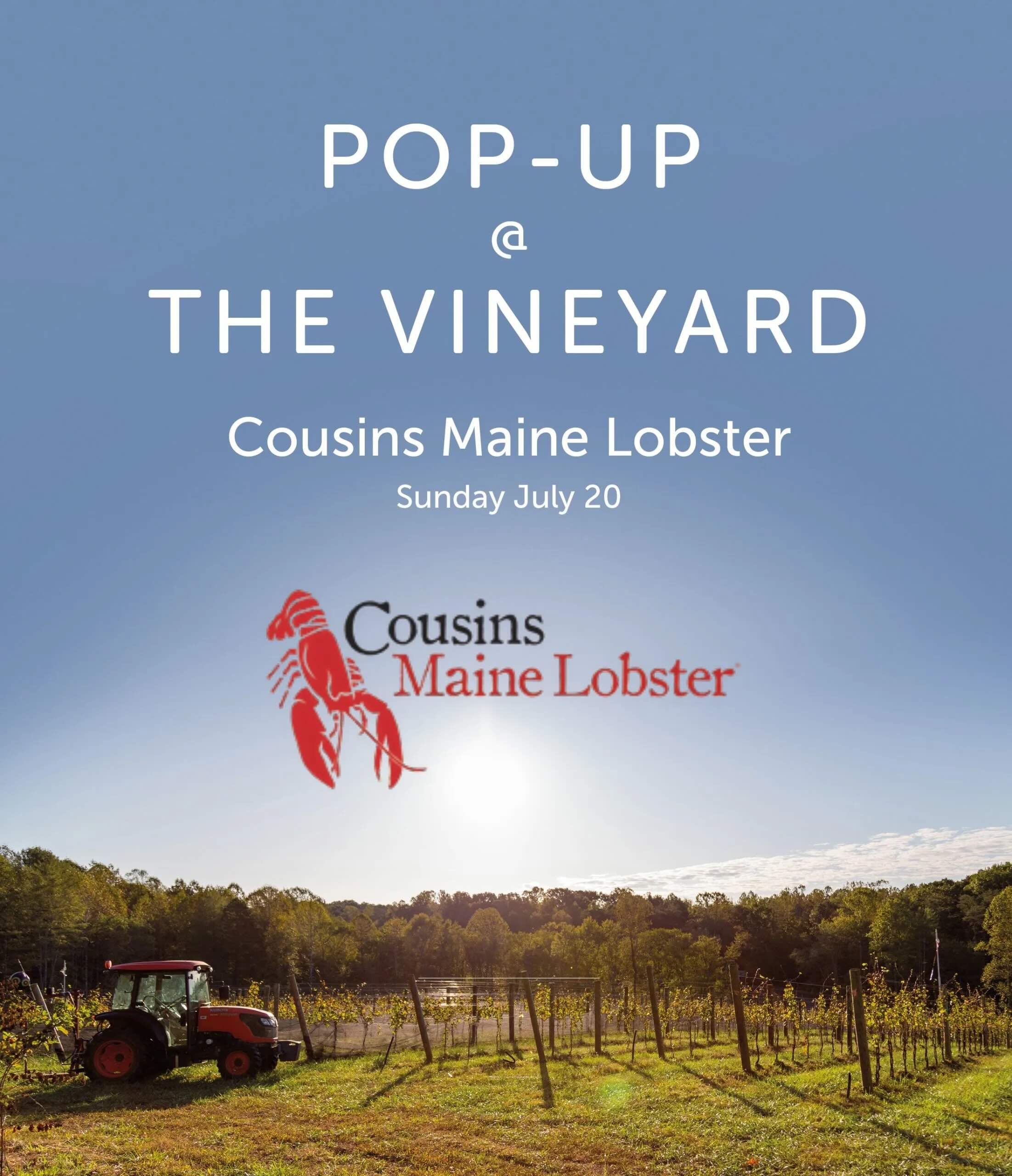 Mark your calendar today so you don’t miss a special Pop-Up @ The Vineyard with Cousins Maine Lobster Food Truck! They will be at the Vineyard from noon until 5 pm on Sunday, July 20th.