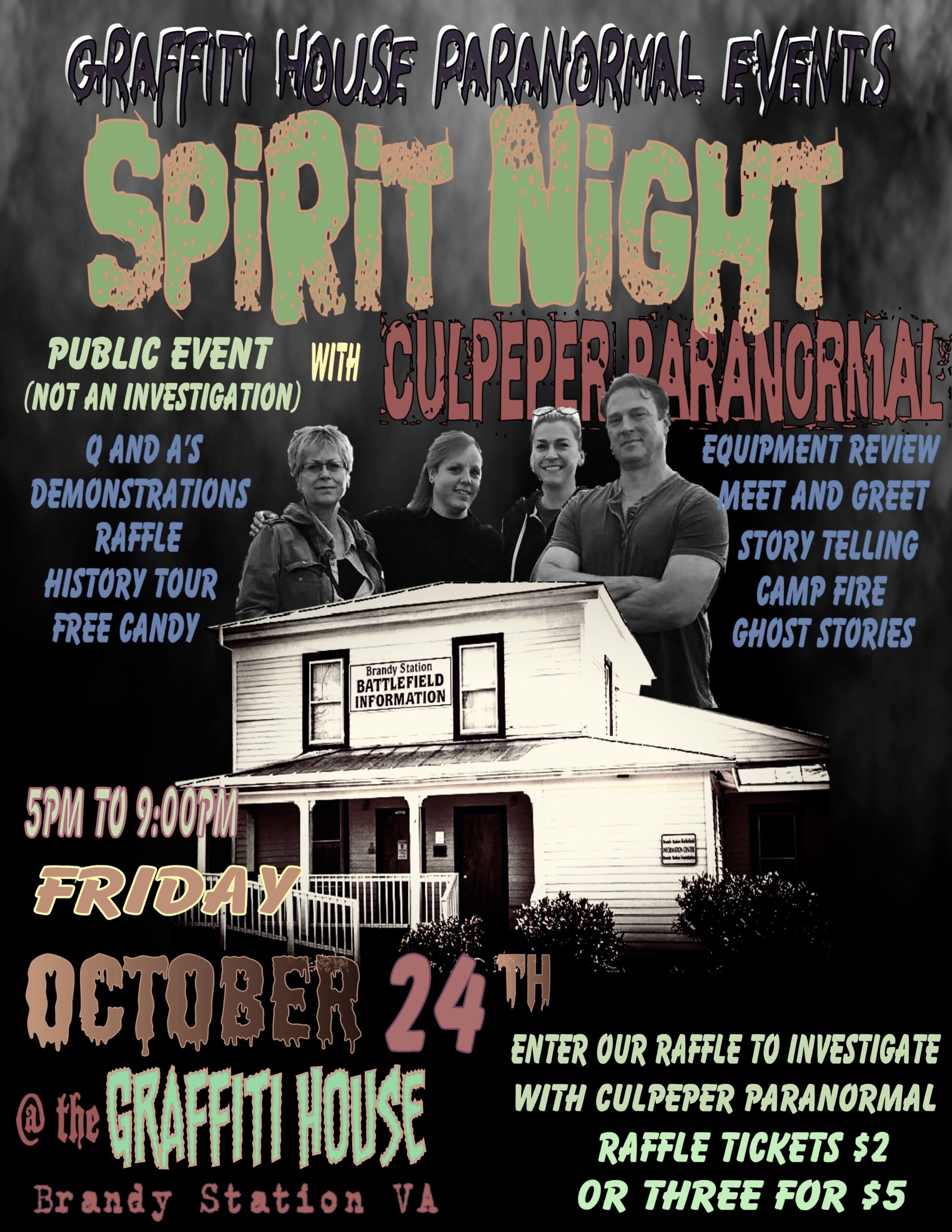 The “Spirits of the Graffiti House” event featuring Culpeper Paranormal in Brandy Station is a free & kid-friendly Halloween event. Come see Culpeper Paranormal anytime between 5PM-9PM! Culpeper Paranormal will be displaying some of their paranormal evidence from various locations & offering equipment demos. Raffle tickets will be sold to win a short paranormal investigation […]