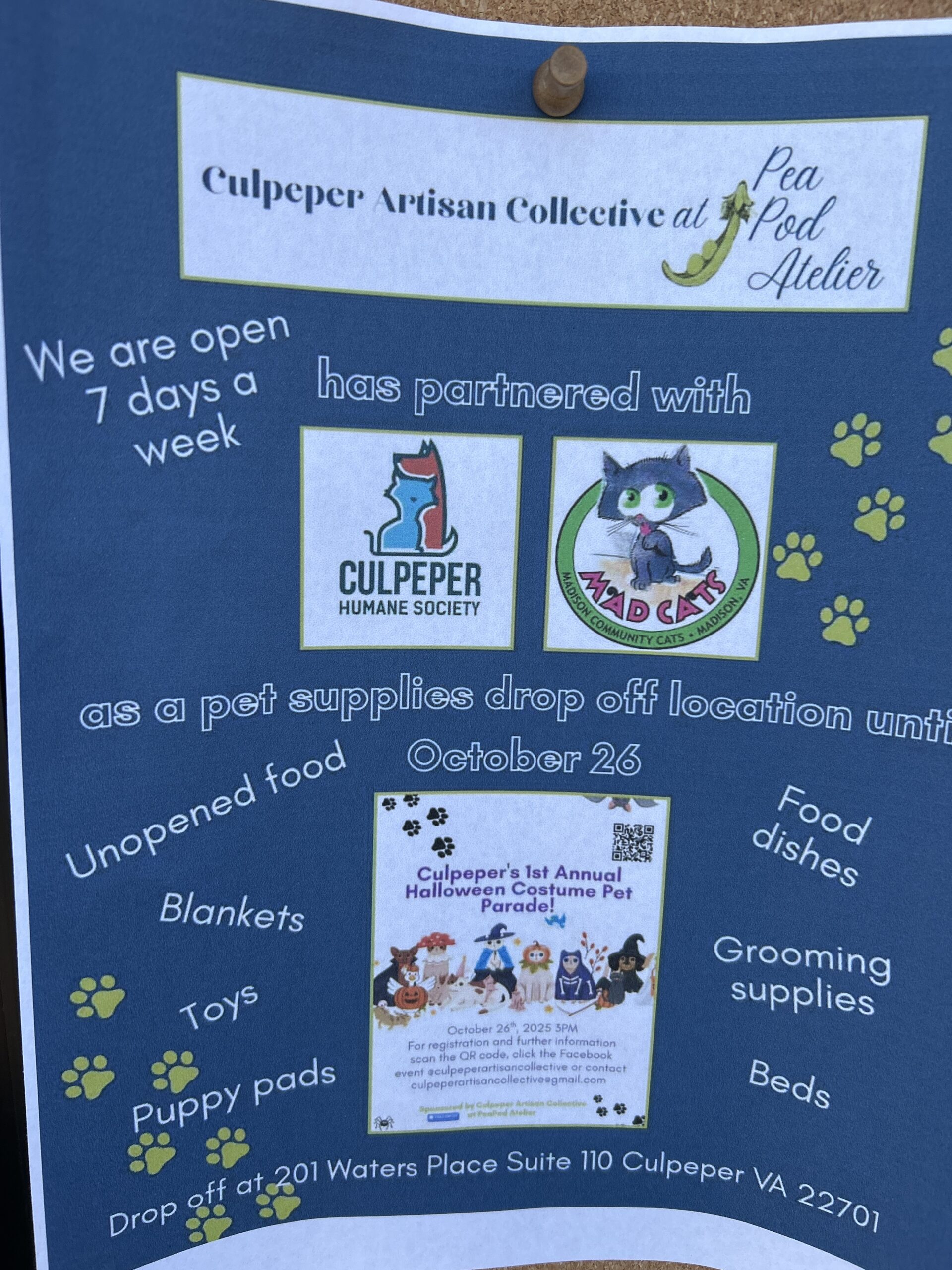 Culpeper Artisan Collective is partnering with MadCat and Culpeper Human Society to help pets in needs A drop off point is set up at their shop. All pet supplies, food, toys, blankets, $ and more are accepted Please help all the sweet animals in need. If you are in need of love and cuddles please […]