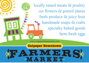 The Culpeper Downtown Farmers Market season runs every Saturday, rain or shine, May through October, from 7:30 am to 12:00 pm, at the Culpeper Baptist Church parking lot (318 South West Street). On select Saturdays throughout the season enjoy live musical performances and special events, including Farmers Market Customer Appreciation Days in June and September, American Grown Flowers Week in July and National Farmers Market Week in August, plus don’t forget the live kid’s cooking class and so much more! Make the Culpeper Downtown Farmers Market a part of your Saturday morning routine and shop small, while supporting local!
